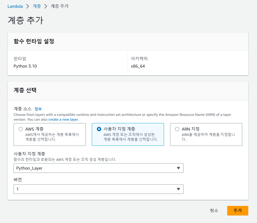 이제 기존에 생성해놓은 람다 함수로 돌아가 계층 추가를 해주면 되는데, 사용자 지정 계층에서 방금 만든 계층과 버전을 선택해준뒤, 추가해줍니다.