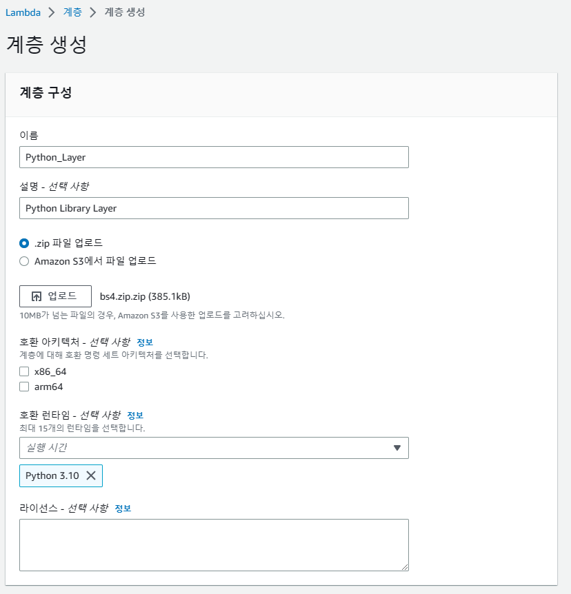 이름은 Python_Layer과 설명은 파이썬 라이브러리 계층으로 써놓은뒤 cmd로 다운로드 받아놨던, bs4 압축파일을 업로드하여 계층을 새로 생성해줬습니다.