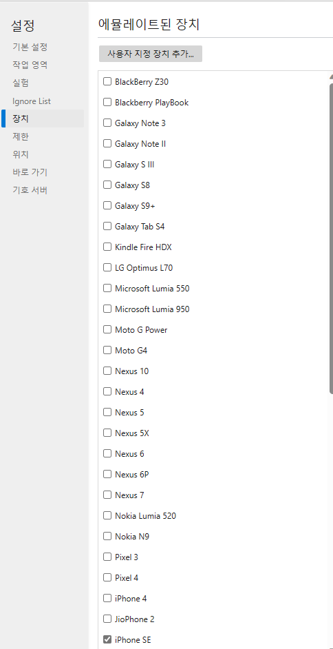 이때 주의 사항은 크롬의 연동 가능한 디바이스를 골라줘야하는데, 이는 F12 개발자 도구 설정을 통해 확인할 수 있습니다.