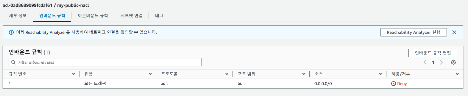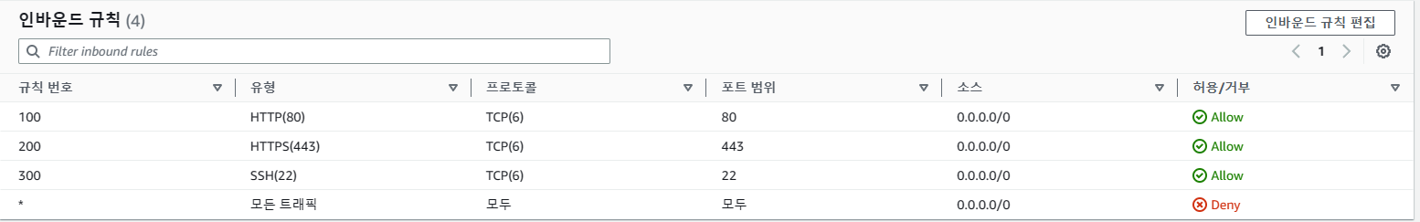 기본적으로 NACL을 생성하면 모두 트래픽이 거부되어 있는데, NACL은 요청 정보를 따로 저장하지 않는다는 Stateless 방식을 지니고 있기 때문에 트래픽에 대한 규칙을 허용해줘야 통신이 가능하게 됩니다. 따라서 인바운드 규칙과 아웃바운드 규칙을 편집해주어야 합니다.