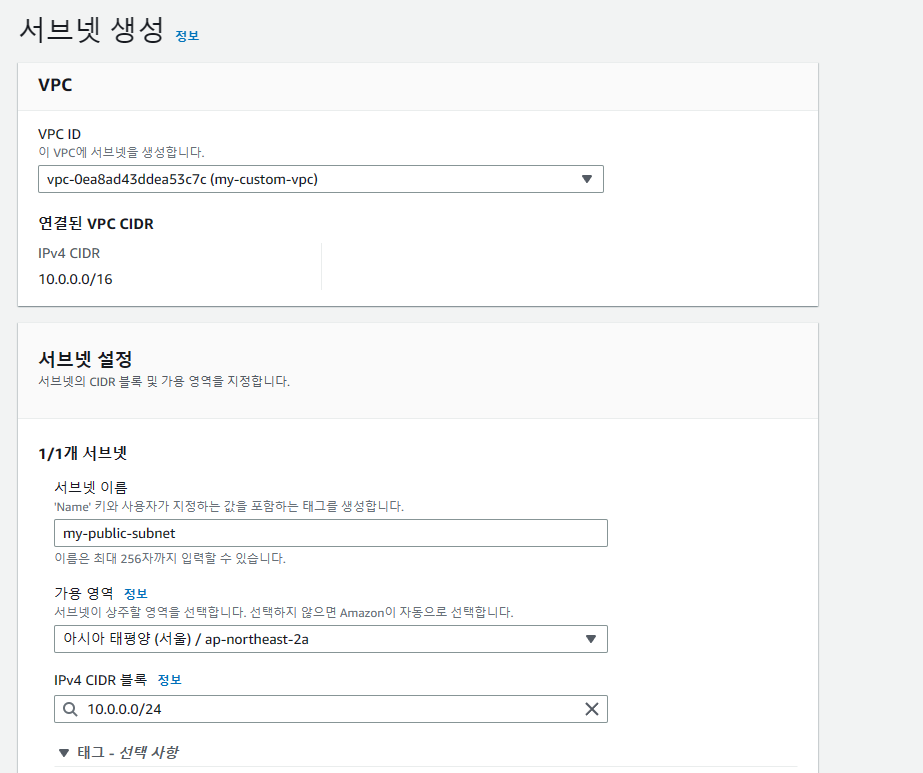 먼저 퍼블릭 서브넷과 프라이빗 서브넷을 구성해보록 하겠습니다.