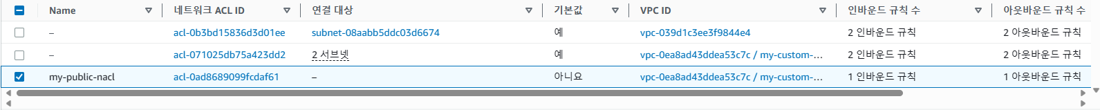 기본적으로 VPC를 생성하면 NACL이 하나 제공되고 있습니다. 따라서 기본적인 NACL은 프라이빗 서브넷에 적용시키고 하나를 더 추가하여 퍼블릭 서브넷에 대한 NACL을 만들어 주도록합니다.