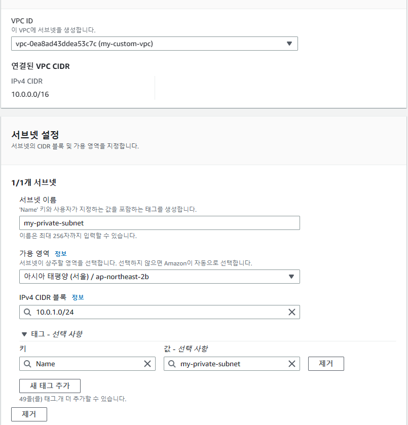 이때 프라이빗 서브넷을 서울리전의 2b 가용영역을 골랐을 경우 프리티어의 인스턴스 유형을 사용하지 못하는데,