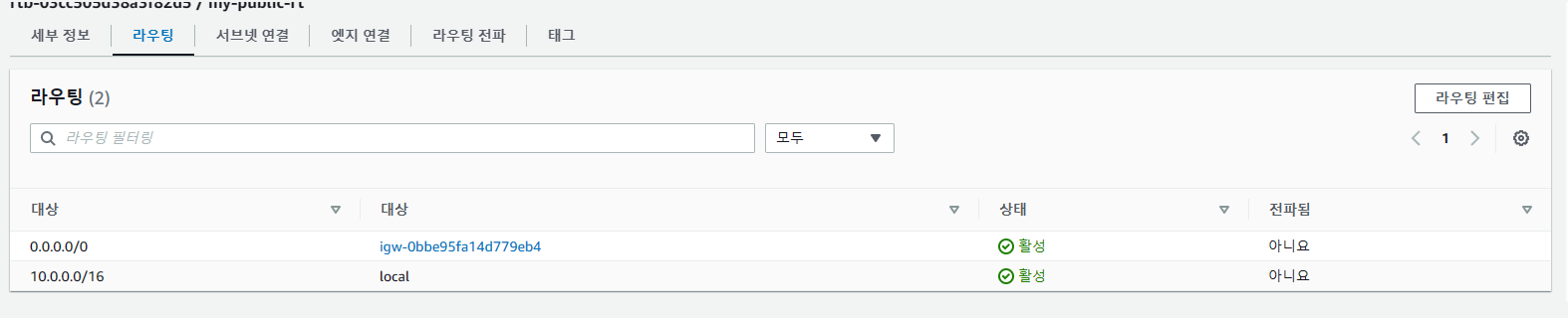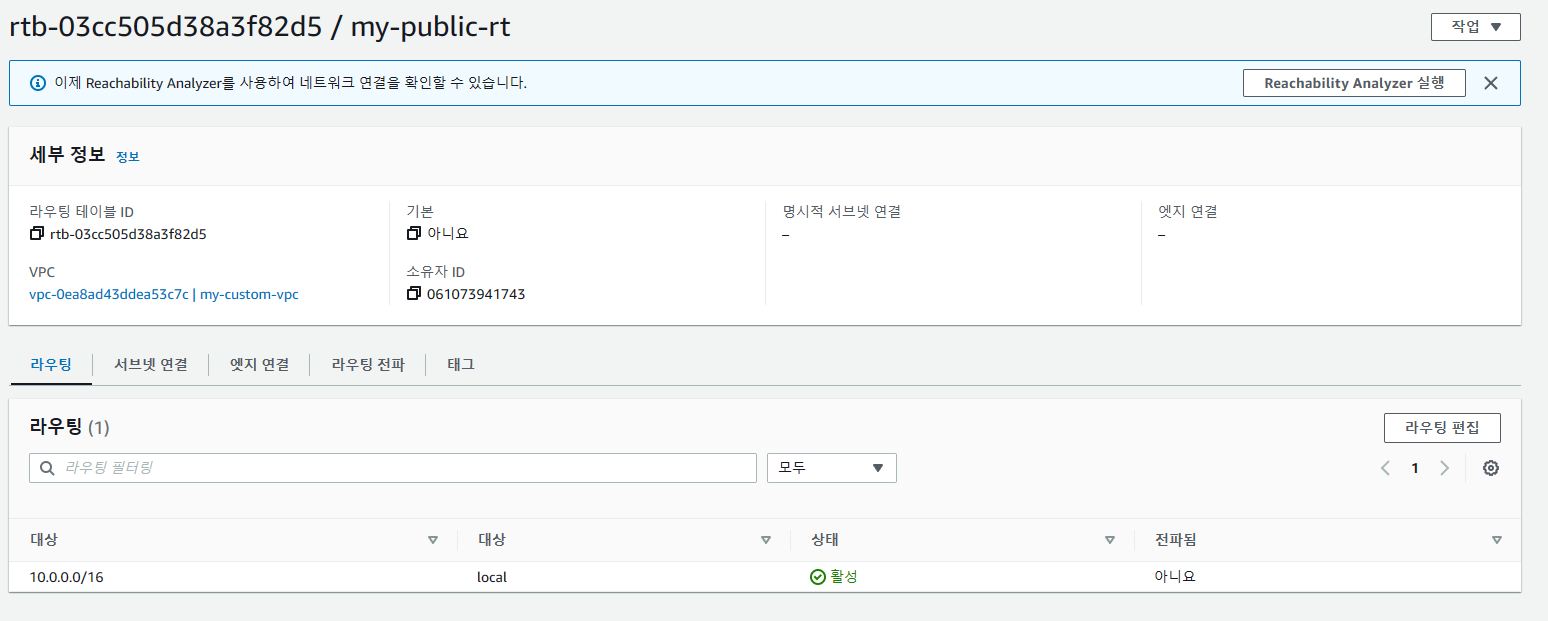 10.0.0.0/16에 대한 트래픽은 로컬로 보내주고 그 외 나머지 트래픽은 인터넷 게이트웨이를 통해 밖으로 보내주도록 설정해줍니다. 또한, 퍼블릭 서브넷을 라우팅 테이블에 붙여주도록 설정합니다.