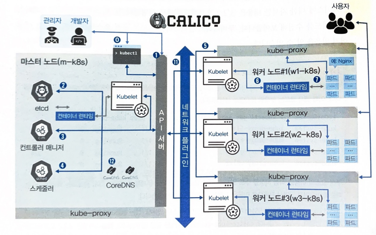 외에 그림에서 보이는 네트워크 플러그인과 CoreDNS는 통신 관계 순서와 상관 없기 때문에 10번대로 구분지어 있습니다.