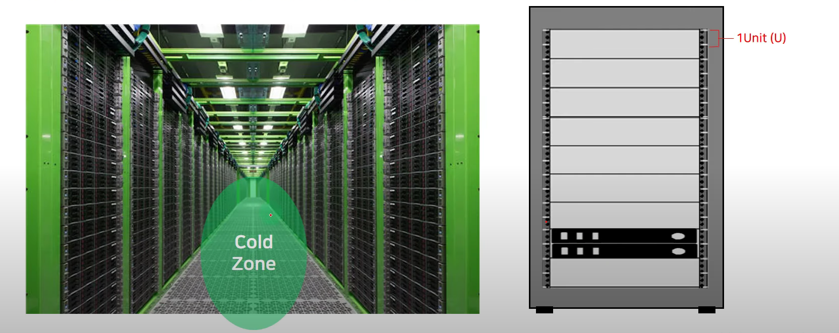 데이터센터에는 장비들을 안전하게 가동시키 위한 냉각시스템이 존재하며, 장비들은 랙에 마운트 되어 운영되게 됩니다.