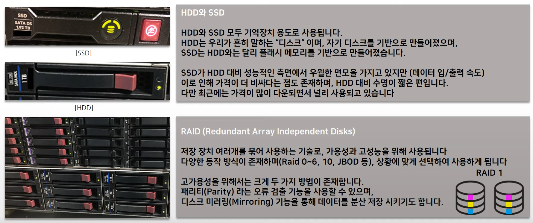 하지만, 이들은 단독으로 사용되지 않으며, 가용성과 성능을 위해 RAID라는 기술로 묶여서 사용됩니다.