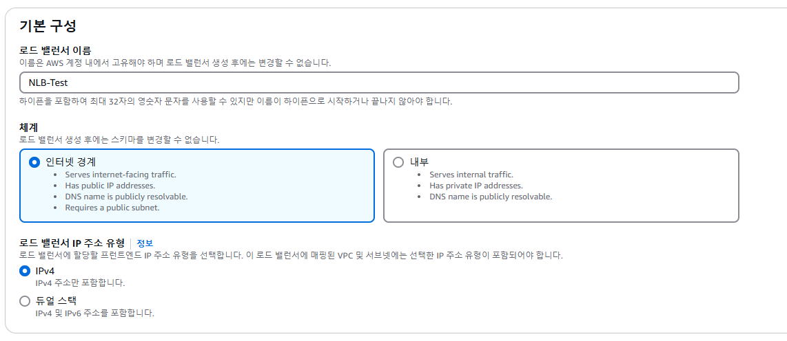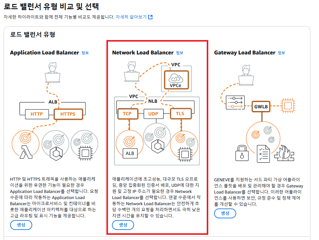 AWS 로드밸런서 서비스에서 네트워크 로드밸런서를 생성해 줍니다.
