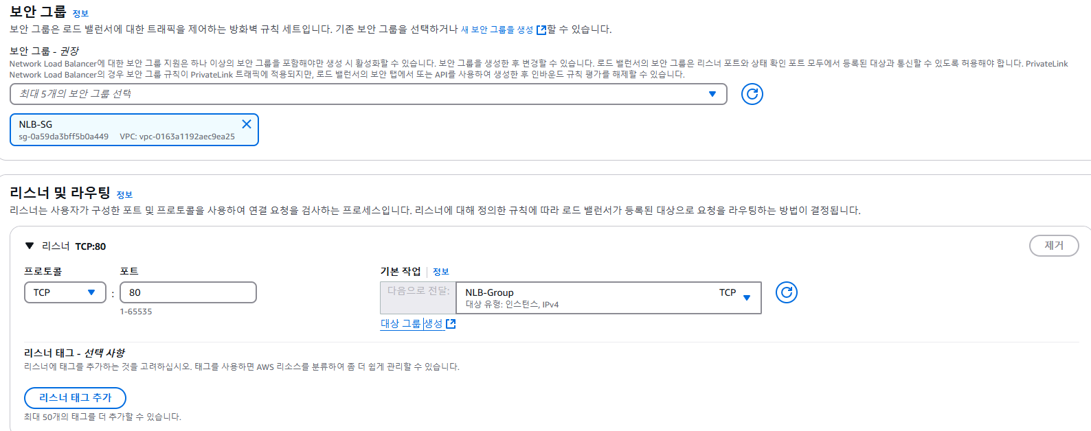 보안 그룹은 사전에 만들어 두었던 SG를 이용하고, 웹 사이트에 대한 로드밸런서를 테스트 할 예정이니 리스너에 80번 포트를 기입한 대상 그룹을 설정해줍니다.
