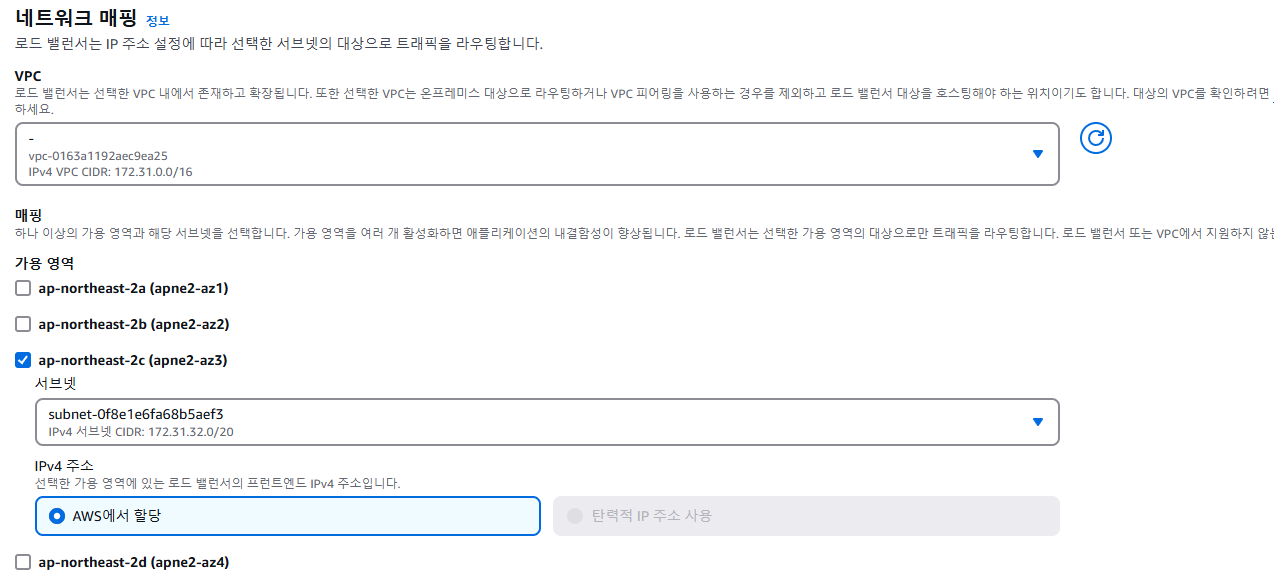VPC 와 가용 영역은 인스턴스에 따라 다르므로, 인스턴스와 동일한 환경을 선택해주면 됩니다.
