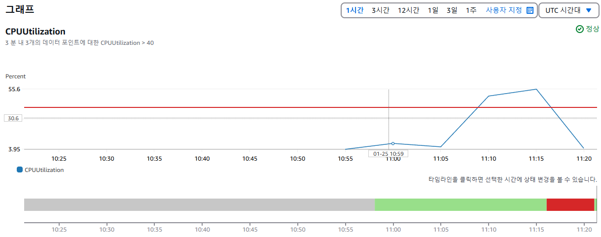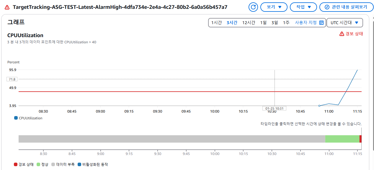 CPU 사용률이 급증하며 오토스케일링 스케일 아웃에 대한 설정(CPU > 40 이상 시 추가 인스턴스 생성)에 따른 인스턴스가 추가적으로 만들어지는 것을 확인할 수 있었습니다. (Cloud Watch 서비스를 통한 CPU 경보 확인)